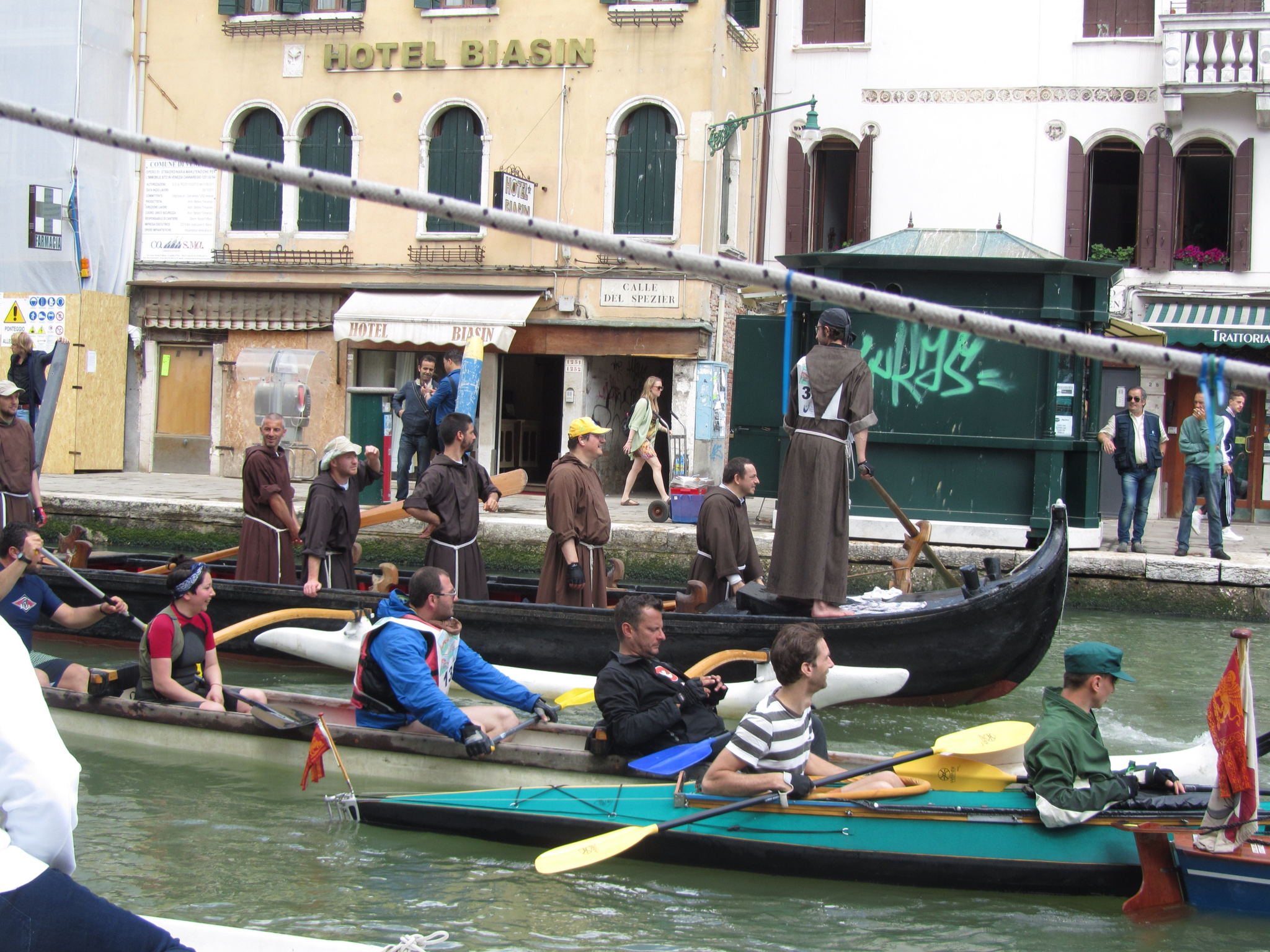 Disappointment abounded as we woke up to torrential rains Sunday morning. We had a leisurely breakfast and made our way to our hotel near the airport in Venice. We were prepared to spend the day at the hotel and only go out for meals. It was still pouring when we arrived so we parked ourselves in the lobby where the wifi was free. I noticed a break in the clouds and suggested that since we were going to go out for lunch anyway that we chance the bus into Venice. The sun came out and stayed out. I love walking around Venice...even though it was not tourist season yet, there were droves of people. There was some sort of regatta which brought out people from all over Europe in anything that floated. There were over 1600 entrants. I think we caught this same race about 5 years ago as well and it was still lots of fun to watch.